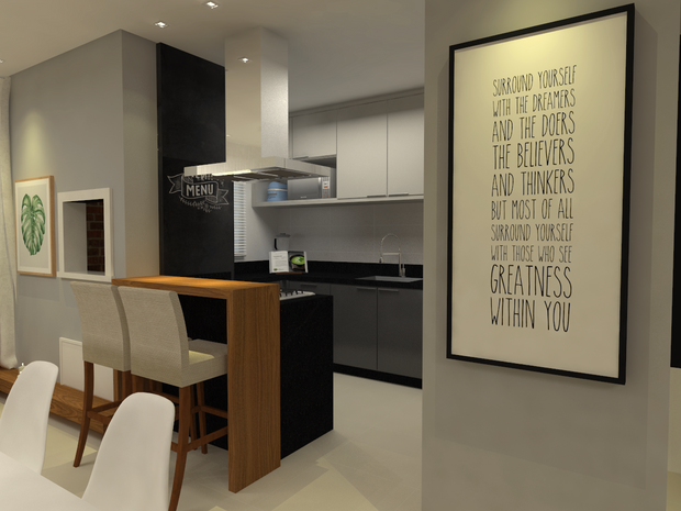Proposta de apartamento para jovem casal com uma suíte. Desenvolvemos toda a proposta de mobiliário e decoração de sala, cozinha, suíte e área de serviço conforme as necessidades e preferências dos clientes.